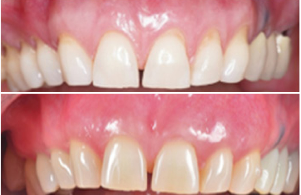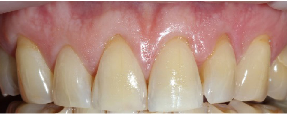 Рис. 1. Рецессия в области фронтальной группы зубов верхней челюсти Miller 1, Cairo Rt 1