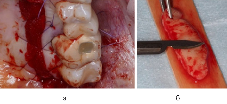 Рис. 3. Забор свободного десневого трансплантата с нёба (а) и его деэпителизация (б)