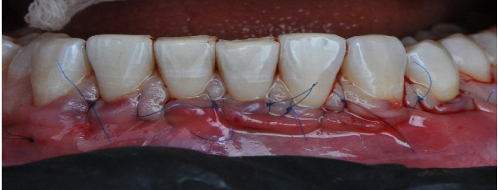 Вначале проводилась антисептическая обработка полости рта 0,05%-м раствором хлоргексидина биглюконата, аппликационная и инфильтрационная анестезии. Затем выполнялись разрезы в области десневой борозды (сулькулярные) через каждую зону рецессии микрохирургическим лезвием с сохранением кончиков десневых сосочков (рис. 2), отслаивание полнослойных лоскутов с помощью микрохирургического распатора. Далее производился забор свободного десневого трансплантата с неба с последующей его внеротовой деэпителизацией и наложением на зону забора параллельных и перекрестных горизонтальных обвивных швов (рис. 3). Позиционирование и фиксация трансплантата в принимающем ложе, ушивание раневой поверхности швами Аллена (рис. 4). Даны рекомендации по послеоперационному ведению: полоскания 0,05%-м раствором хлоргексидина биглюконата 2 раза в день в течение 2 недель, назначены противовоспалительные и обезболивающие лекарственные препараты (НПВС). Повторная явка через день. Швы снимались на 7–10-е сутки. Контрольные осмотры проводились через 3 и 6 месяцев, 1, 2 и 3 года соответственно, оценивалось состояние мягких тканей в области хирургического вмешательства и степень закрытия рецессий десневого края.