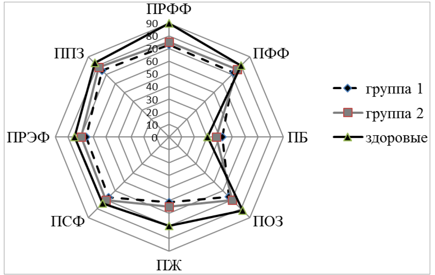 Величина ПФФ в группах больных не достигла (р < 0,05) аналогичных значений у здоровых (80,2 ± 1,44). Величина показателя боли (ПБ) в группах больных равнялась 42,1 ± 0,16 и 37,2 ± 1,35 соответственно, р < 0,05. ПБ в обеих группах больных после окончания реабилитации достоверно (р < 0,05) превосходил группу контроля (30,1 ± 2,11). Показатель общего здоровья (ПОЗ) у больных равнялся 66,7 ± 1,19 и 70,2 ± 1,44 соответственно, р < 0,05. Показатель жизнеспособности (ПЖ) в группах больных равнялся 51,4 ± 1,48 и 54,9 ± 1,69, р < 0,05. Величина ПЖ на фоне реабилитации не достигла соответствующего аналогичного значений в контроле (69,9 ± 2,90, р < 0,01). Показатель социального функционирования (ПСФ) в группах больных равнялся 67,5 ± 1,24 и 70,3 ± 1,50, р < 0,05. И хотя величина ПСФ достоверно выросла в группе 2, все же не соответствовала значению у здоровых (74,1 ± 1,93). Показатель ролевого эмоционального функционирования (ПРЭФ) в группах больных равнялся 65,4 ± 0,70 и 69,2 ± 1,58, р < 0,05. Несмотря на то, что величина ПРЭФ в группе 2 приблизилась к контрольной, все же имели место статистически значимые (р < 0,05) отличия от группы здоровых. Показатель психологического здоровья (ППЗ) в группах больных равнялся 74,6 ± 1,30 и 78,4 ± 1,65 соответственно, р < 0,05. Различия между группами больных и здоровых (83,0 ± 2,06) оказались статистически достоверными (р < 0,05).