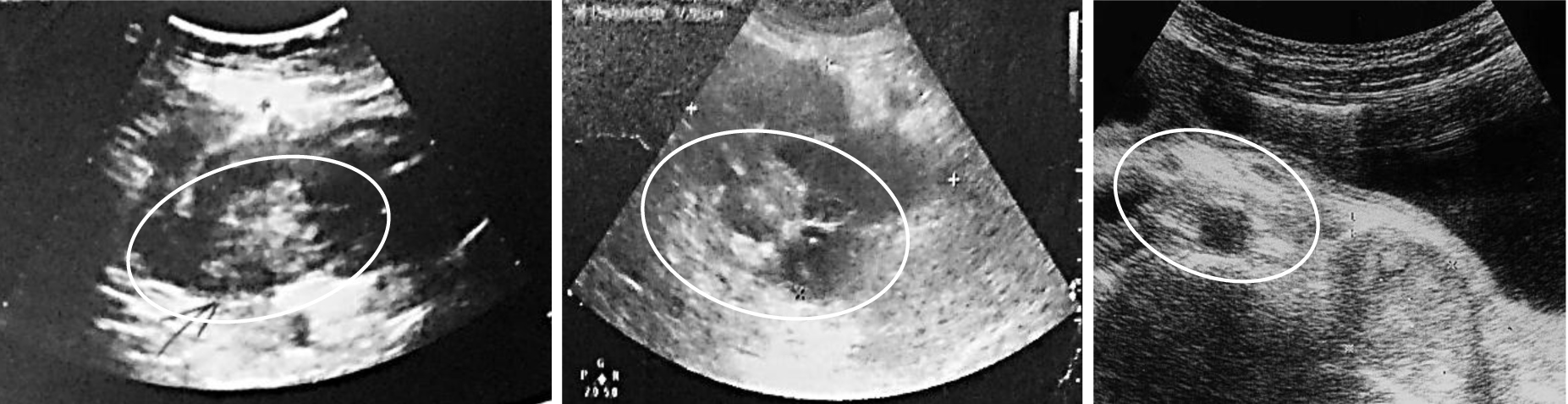 Рис. 2. Гетерогенные внутрипросветные структуры неправильной формы на фоне расширенных петель тонкой кишки (выделены белым контуром)
