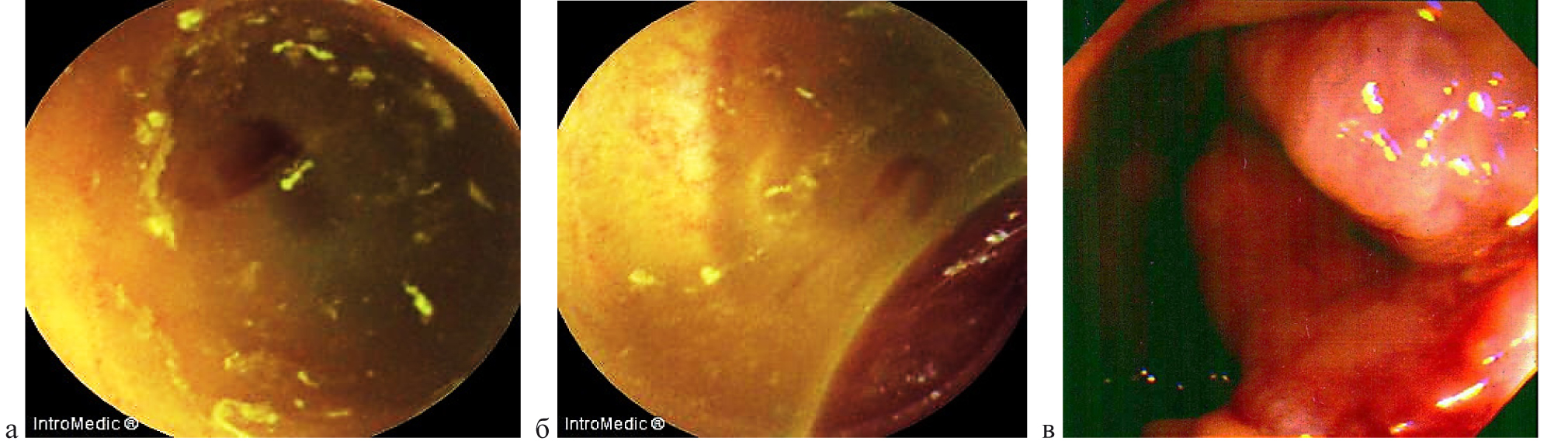 Рис. 4. Капсульная энтероскопия: а) продолжающееся кровотечение из подслизистого образования; б) фиксированный сгусток в просвете кишки; в) экзофитная опухоль