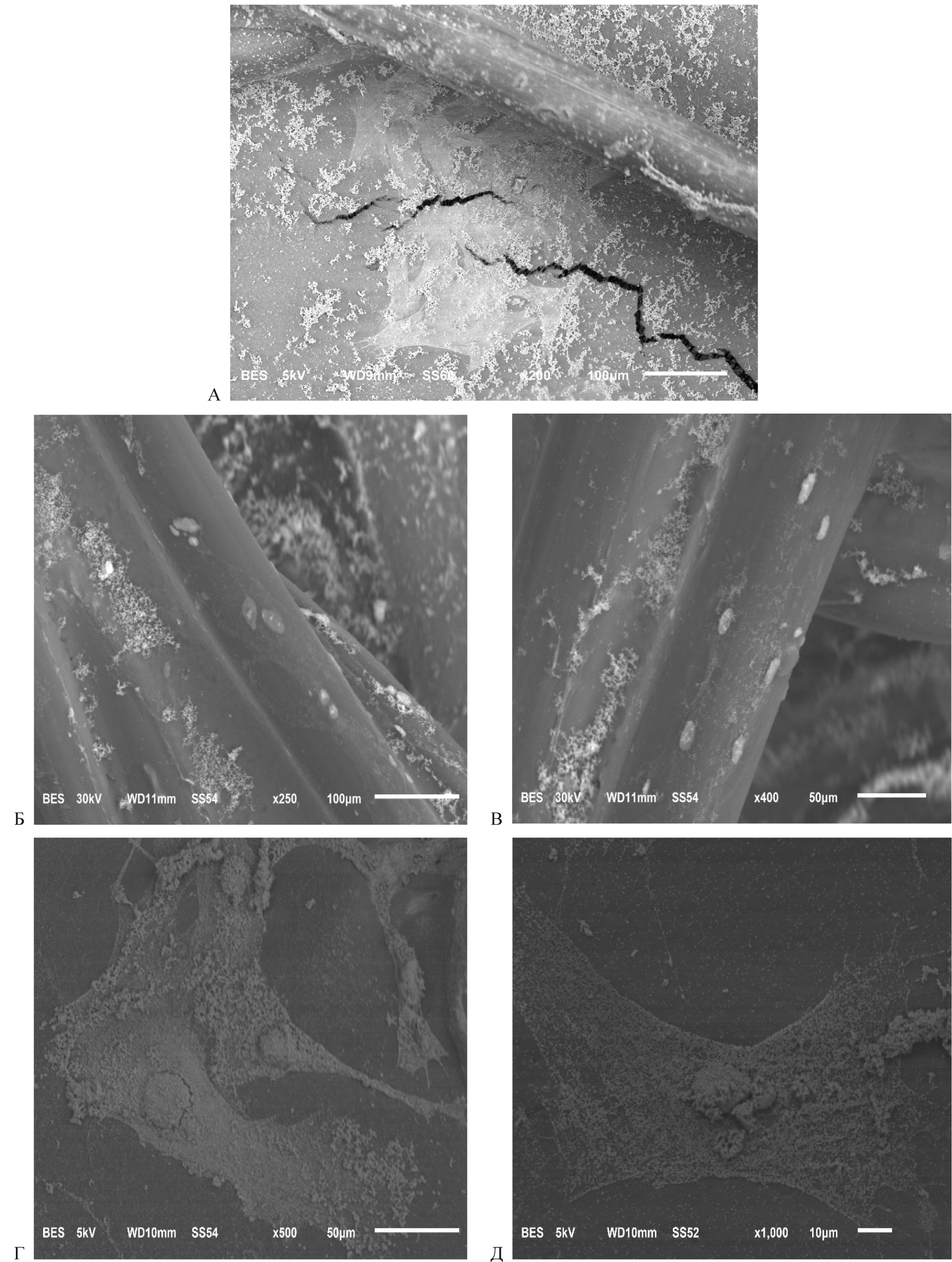 В группе «Унифлекс стандартный» с последующей обработкой поликапролактоном вокруг нитей протеза визуализировались группы фибробластов. Большая часть клеток имели распластанную или вытянутую форму, что свидетельствует о прочности прикрепления к материалу (рис. Б, Д). Важно, что клеточный рост определялся как вокруг мест переплетения, так и между прямыми нитями.