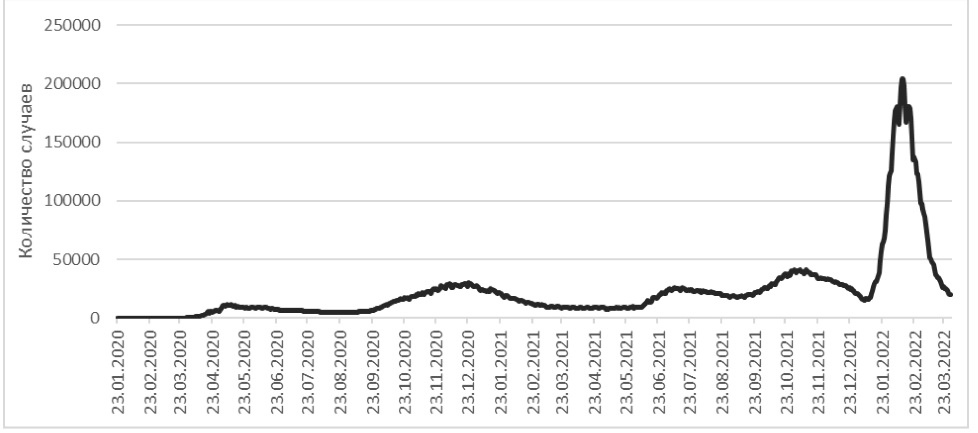 Рис. 1. Динамика новых случаев заражения коронавирусом в Российской Федерации (с 23.01.2020 г. по 30.03.2022 г.)