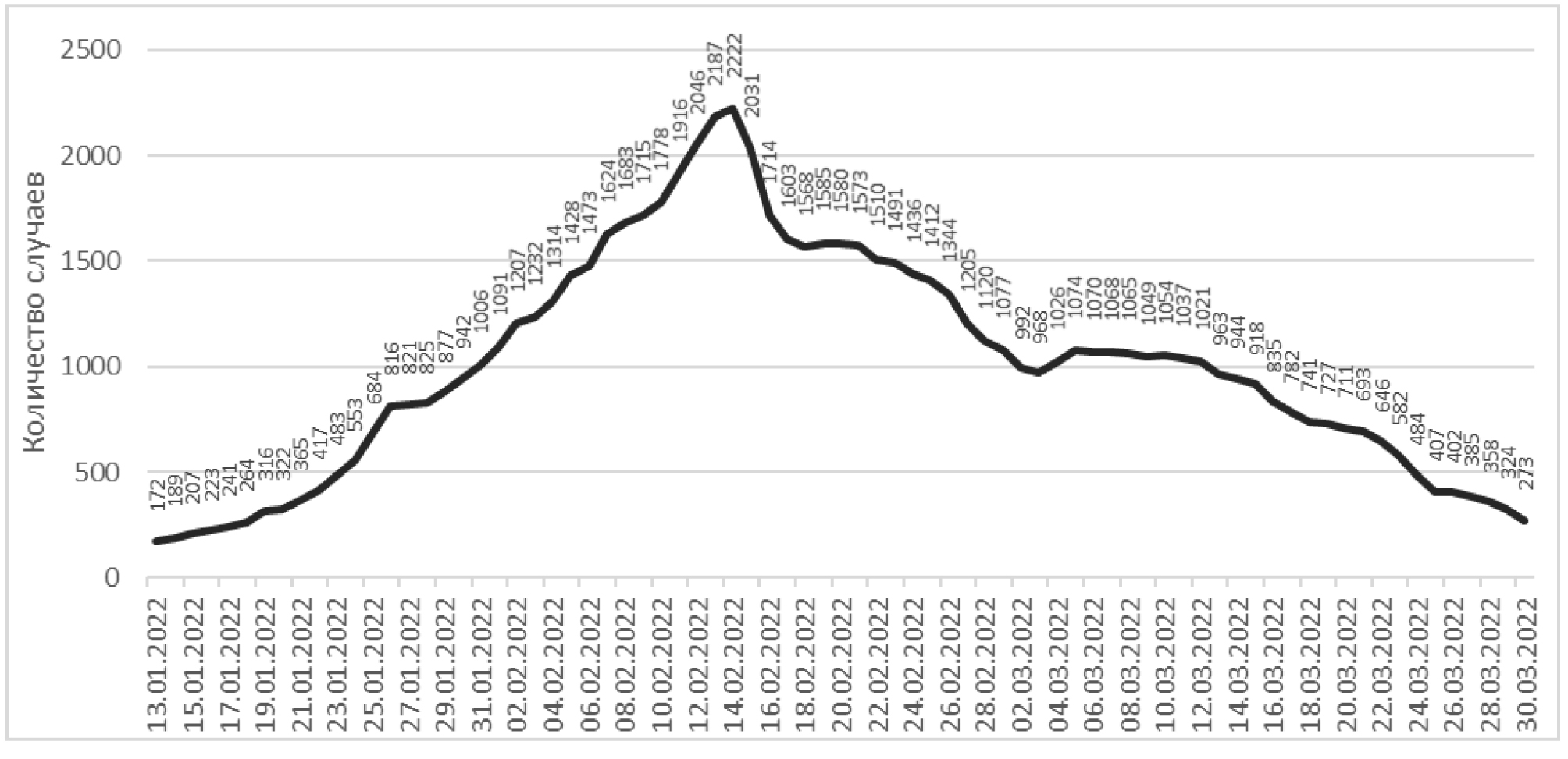 Рис. 3. Динамика новых случаев заражения коронавирусом в Волгоградской области в четвертую волну пандемии COVID-19 (за период с 13.01.2022 г. по 30.03.2022 г.)