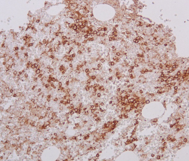 При исследовании ткани легких в стенке сосудов видны плотные гомогенные массы, дающие положительную реакцию на амилоид. При исследовании органов в поляризационном микроскопе обнаружено зеленоватое свечение амилоида. В костном мозге скопление клеток, дающих положительную реакцию с моноклональными антителами к CD38 (рис. 5, 6).