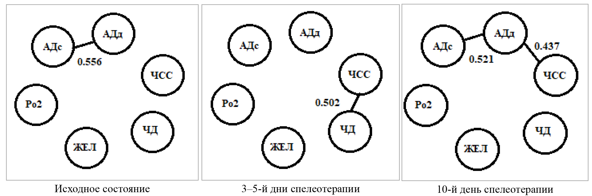 После десятого сеанса спелеотерапии выявлены значимые корреляционные связи между систолическим и диастолическим давлением и между диастолическим давлением и частотой сердечных сокращений (внутрисистемные связи).