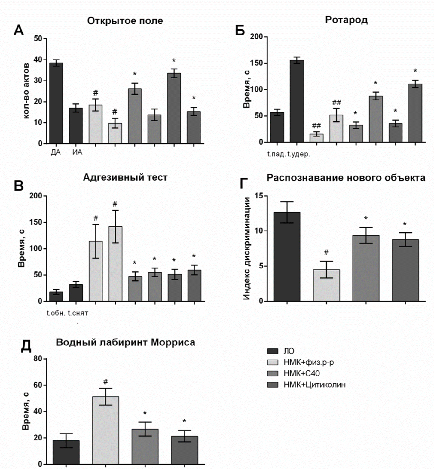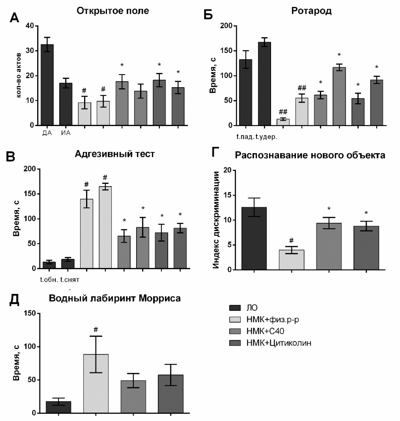 У животных через 40 дней после моделирования хронического НМК в сравнении с ложнооперированными животными отмечалось выраженное снижение двигательной и исследовательской активности в тесте «Открытое поле», нарушение координации движений в тесте ротарод, сенсомоторной функции в адгезивном тесте, а также когнитивные нарушения в тестах распознавание нового объекта и водный лабиринт Морриса (рис. 3А–Д). У животных, получавших в течение этого времени соединение С40 и препарат сравнения цитиколин, все отмеченные неврологические нарушения были выражены в значительно меньшей степени, чем у контрольной группы животных.