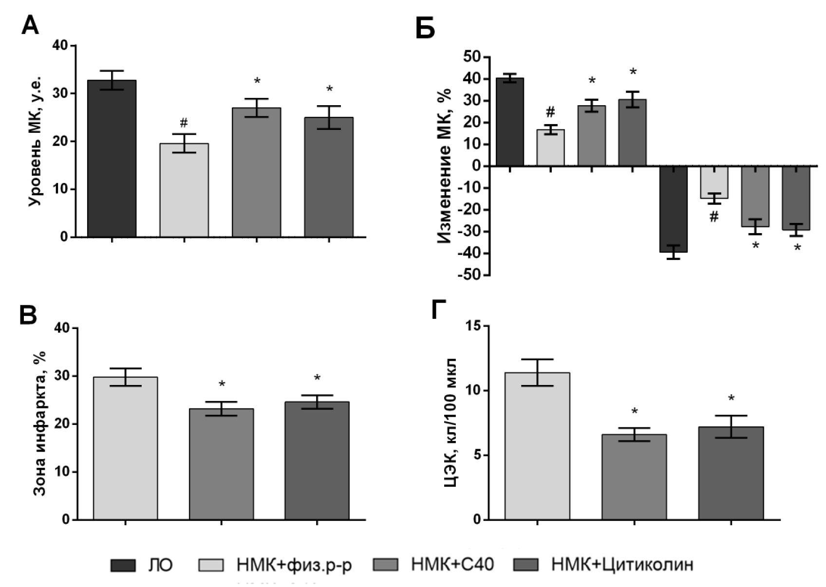 После оценки неврологических нарушений у животных с ОСМА важно сопоставить их с мозговым кровообращением и состоянием эндотелия ГМ. По результатам этого этапа было отмечено, что нейропротекторные свойства соединения С40 и цитиколина можно связать с их выраженным положительным действием на мозговое кровообращение и эндотелиальную функцию (рис. 5А и Б), что вероятно способствовало формированию меньшей зоны инфаркта (рис. 5В), и, как следствие, меньшему неврологическому дефициту.