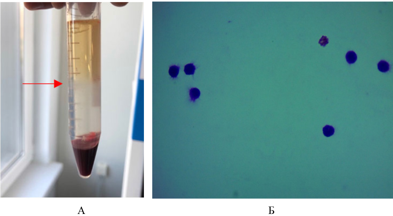 Рис. 7. Мононуклеарные клетки: А – выделение мононуклеаров при помощи раствора Ficoll-Paque Plus плотностью 1,077 g/ml (стрелкой обозначена фракция на границе раздела плазмы и фиколла); Б – подсчет мононуклеаров в камере Горяева; окраска по Романовскому – Гимзе; ув. ×1000