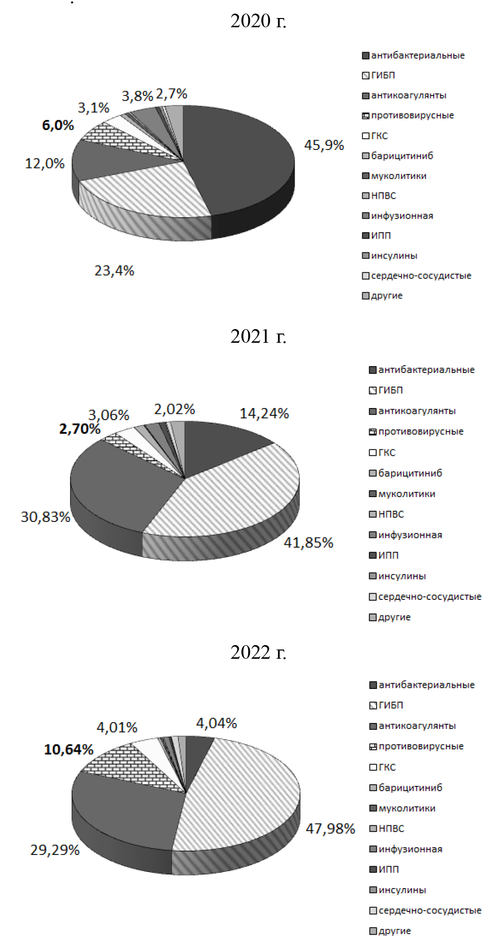 В 2020 и 2021 гг. на закупку противовирусных ЛС было затрачено 6,0 % и 2,7 % от общих затрат на ЛС, при этом в сегменте А противовирусные ЛС отсутствовали (рис.). Снижение относительной доли затрат на противовирусные ЛМ в 2021 г. было вызвано значительным увеличением расходов на генноинженерные биологические препараты (ГИБП), при этом в абсолютных значениях затраты на противовирусные препараты в 2021 г. были на 17,9 % выше, чем в 2020 г. Сегмент В в 2020 г. включал препараты интерферон бета-1в, фавипиравир, лопинавир/ритонавир и уминофер (40,1 % расходов сегмента В), в 2021 г. – фавипиравир и ремдесевир. Сегмент С в 2020 и 2021 г. включал гидроксихлорохин, умифеновир, интерферон-альфа, ингавирин и рибавирин, последний только в 2020 г. В 2022 г. на закупку противовирусных ЛС было затрачено 10,6 % всех средств, из них в сегмент А вошел ремдесевир (7,5 % средств сегмента А), в сегмент В –фавипиравир (32,9 % средств сегмента А) и сегмент С – умифеновир, интерферон-альфа, ингавирин (8,8 % средств сегмента С).