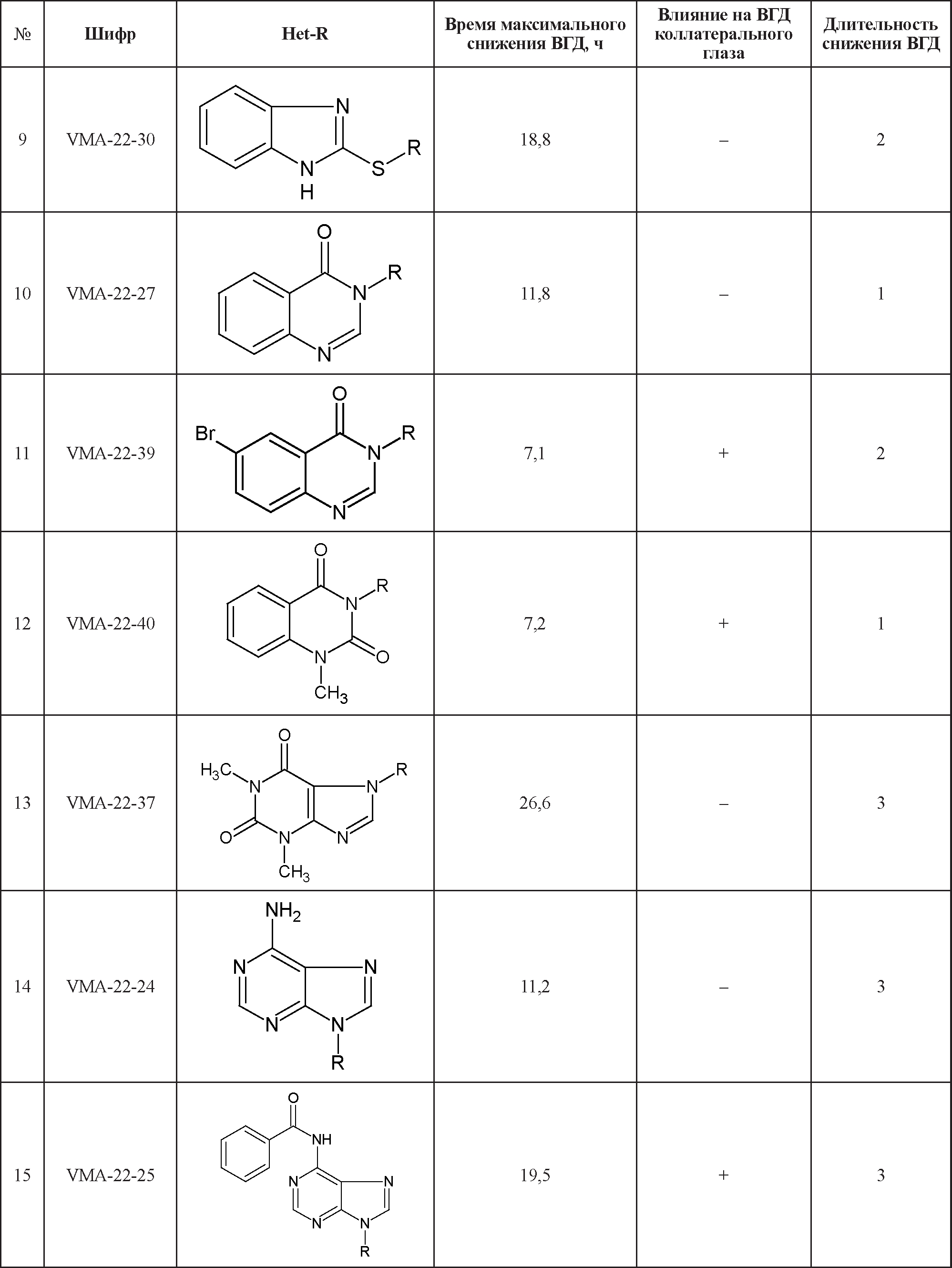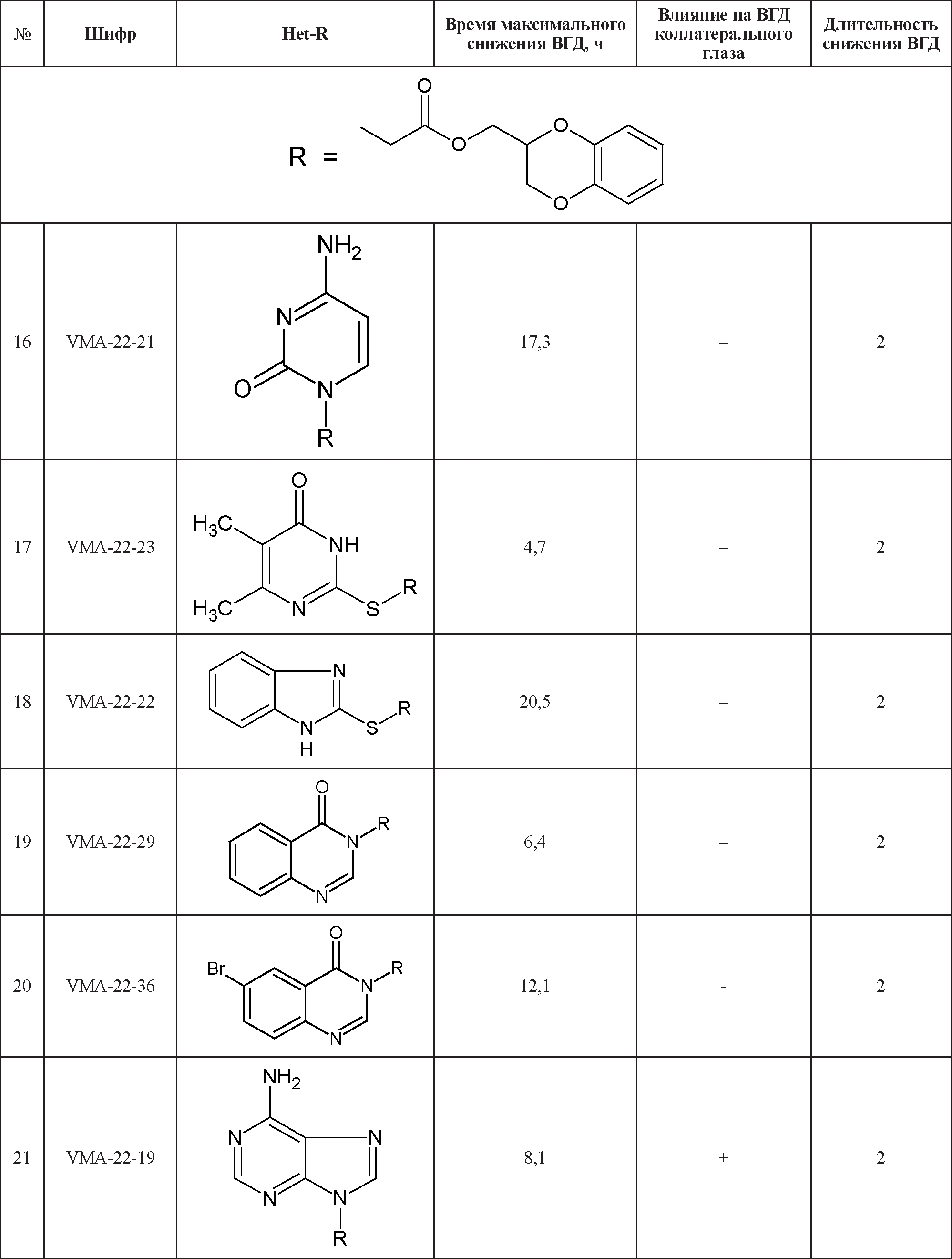 При изучении влияния синтезированных изостеров мелатонина на ВГД было выявлено, что все синтезированные производные (бензодиоксан-2-ил)метанола по снижающей активности ВГД уступают мелатонину. При этом в большей степени снижали уровень ВГД соединения, содержащие в своей структуре бензимидазольную и пуринергическую гетероциклическую системы. Наименьшую активность проявили соединения, имеющие в своей структуре хинозолиновую гетероциклическую систему. Из 19 соединений наиболее эффективно снижало ВГД, на 26,6 %, соединение VMA 22-37, превосходя по своей активности тимолол и практически не уступая мелатонину. Так, тимолол снижал ВГД уже через 30 мин после введения на 24,4 %, мелатонин при инстилляции снижал офтальмотонус на 33,3 %.