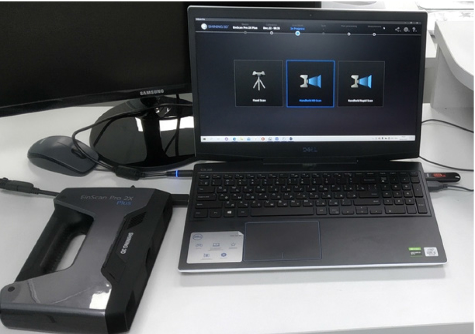 Согласно дизайну исследования, на первом этапе проведены краниометрические исследования на черепах мужского пола зрелого возраста 2-го периода с использованием оригинальной программы Skull anatomy (свидетельство о государственной регистрации программы для ЭВМ № 2021663704 от 20.08.2021 г.) [9]. Для получения изображения объекта применялся многофункциональный портативный 3D-сканер Shining 3D EinScan Pro 2X Plus (рис. 1).