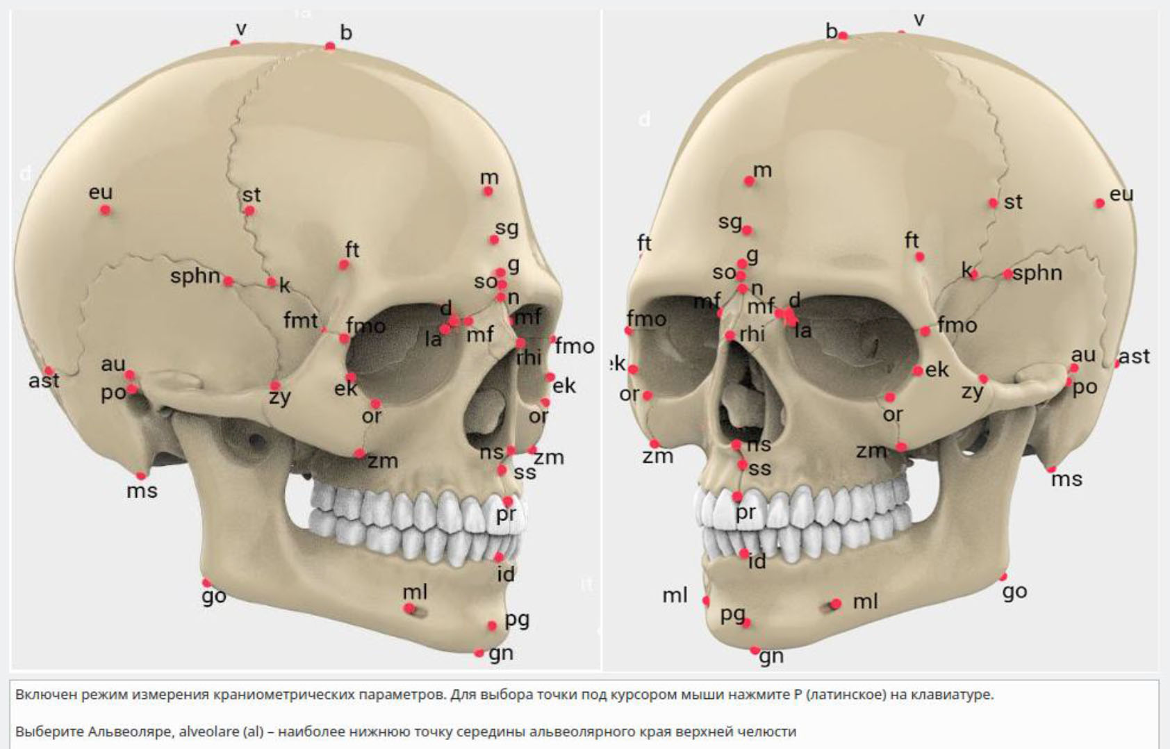 С использованием программы определялись краниометрические точки по Р. Мартину с учетом поправок В. П. Алексеева и Г.Ф. Дебеца (1964): альвеоляре (al), базион (ba), брегма (b), глабелла (g), дакрион (d), зигион (zy), зигомаксилляре (zm), назион (n), назоспинале (ns), назолатерале (nl), опистокранион (op), простион (pr), фронто-маляре-темпорале (fmt), эурион (eu) (рис. 2, 3).