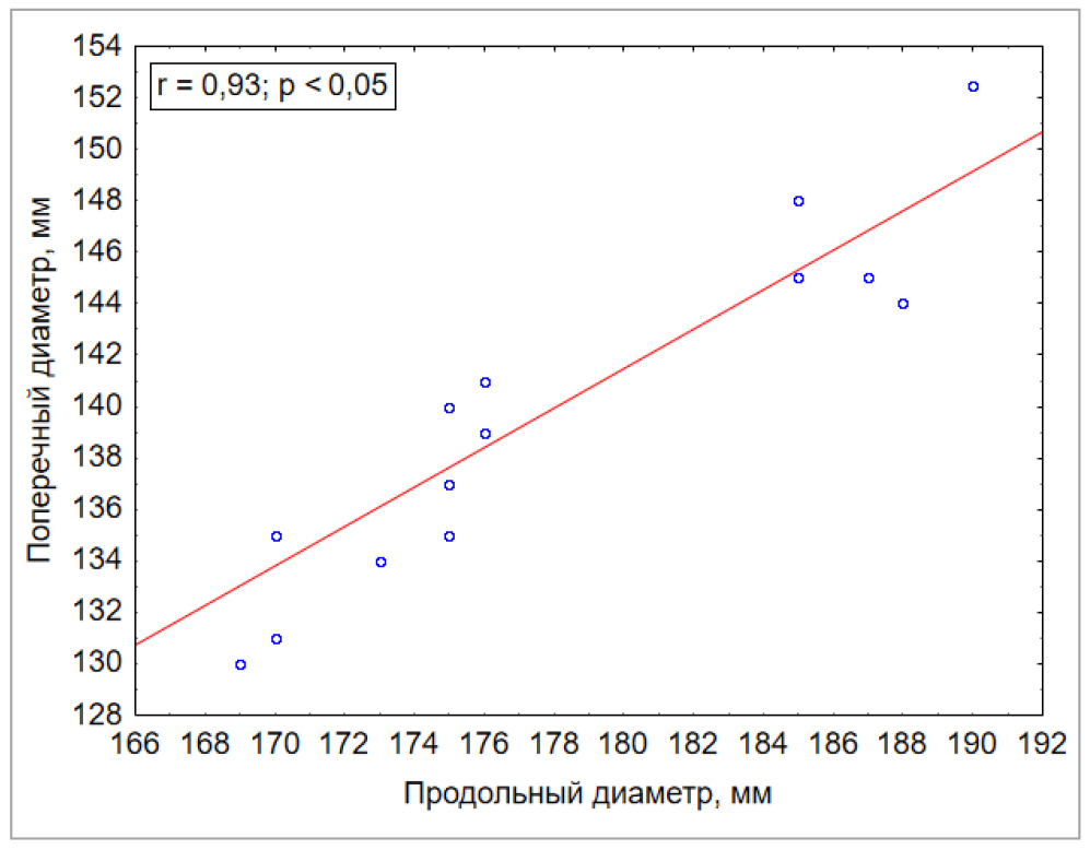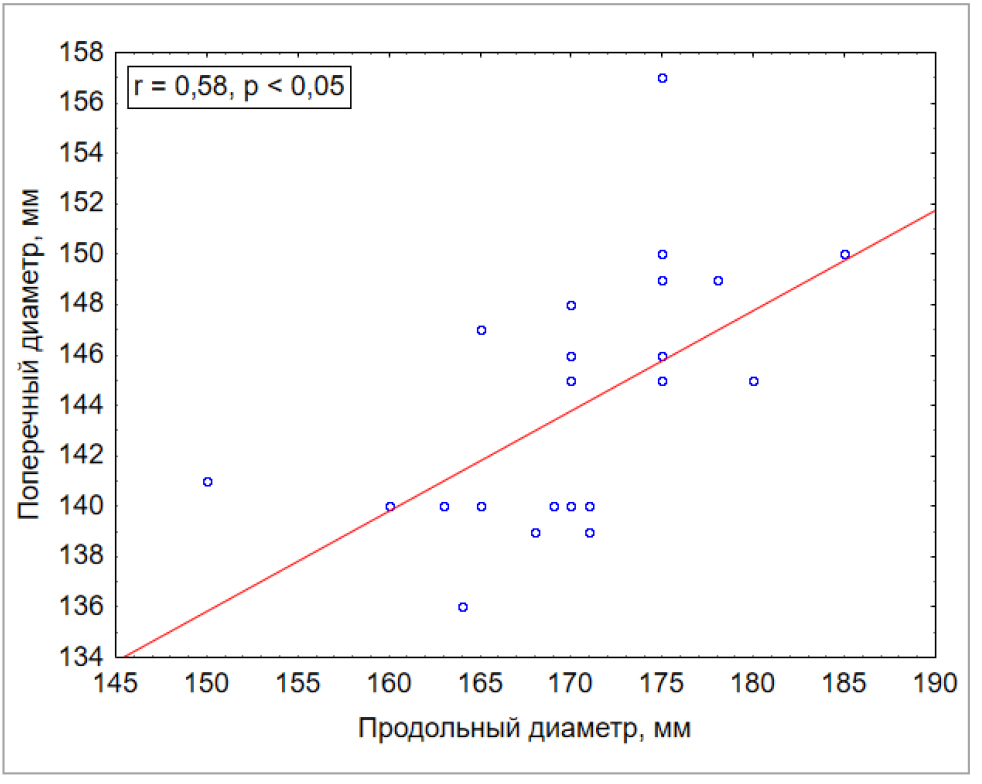 Рис. 4. Зависимость между поперечным и продольным диаметрами у брахиокранической формы черепа. Корреляционный параметр Спирмена, p < 0,05