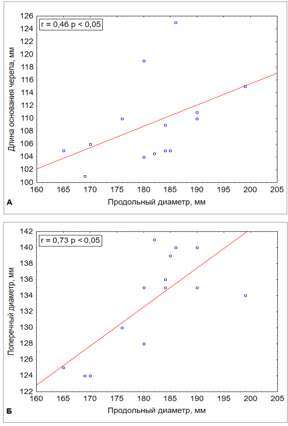 Рис. 5. Зависимость: А – между длиной основания черепа и продольным диаметром у долихокранической формы черепа; Б – между поперечным и продольным диаметрами у долихокранической формы черепа. Корреляционный параметр Спирмена, p < 0,05