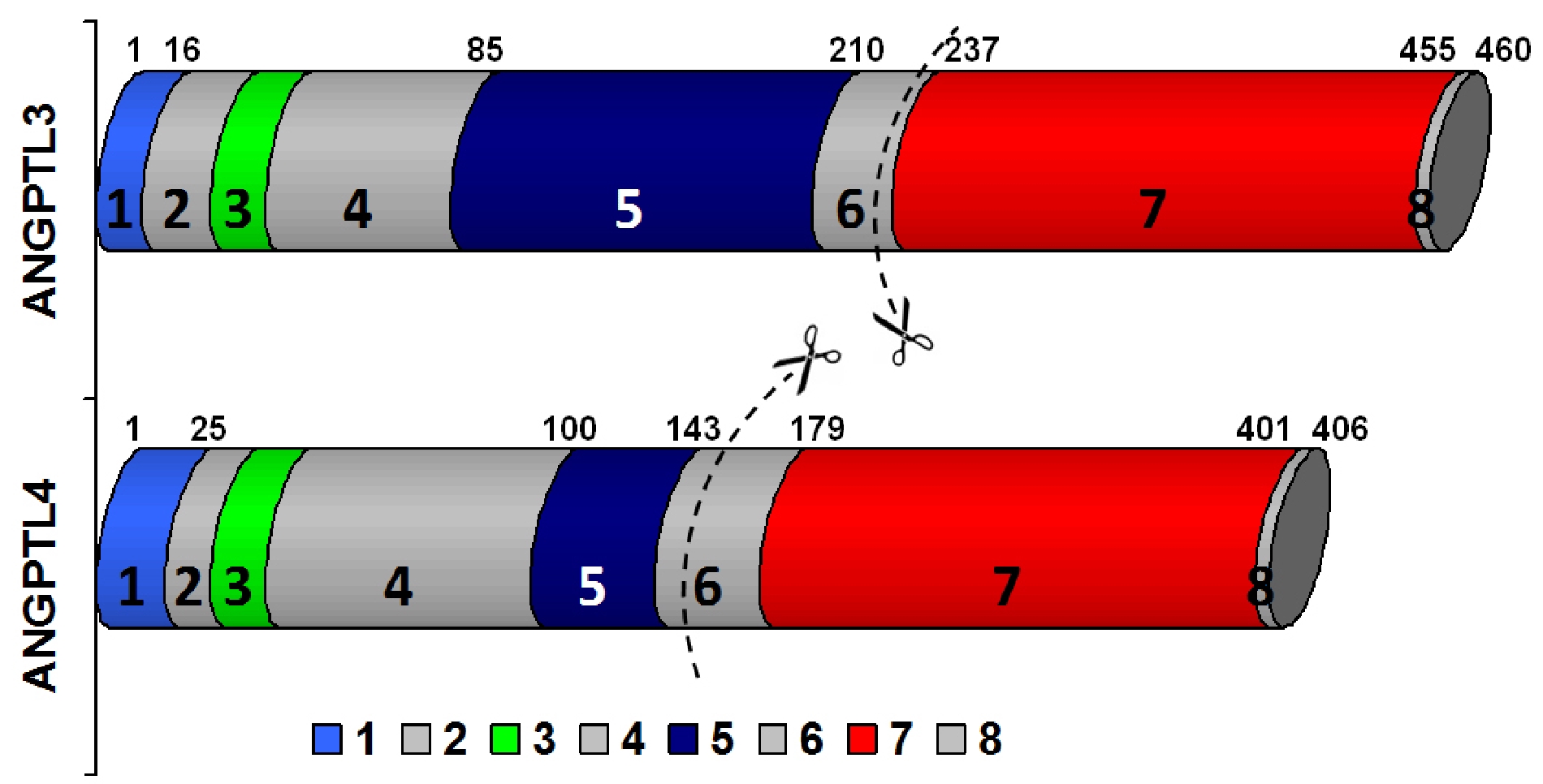 Рис. Структура ANGPTL 3-го и 4-го типов (уровни протеолитического расщепления обозначены пунктиром): 1 – N-концевой спиральный домен; 2, 4, 6, 8 – неизвестные доменные структуры; 3 – участок, специфичный для ЛПЛ; 5 – линкерная область (coiled-coil domain); 7 – С-концевой фибриноген-подобный домен