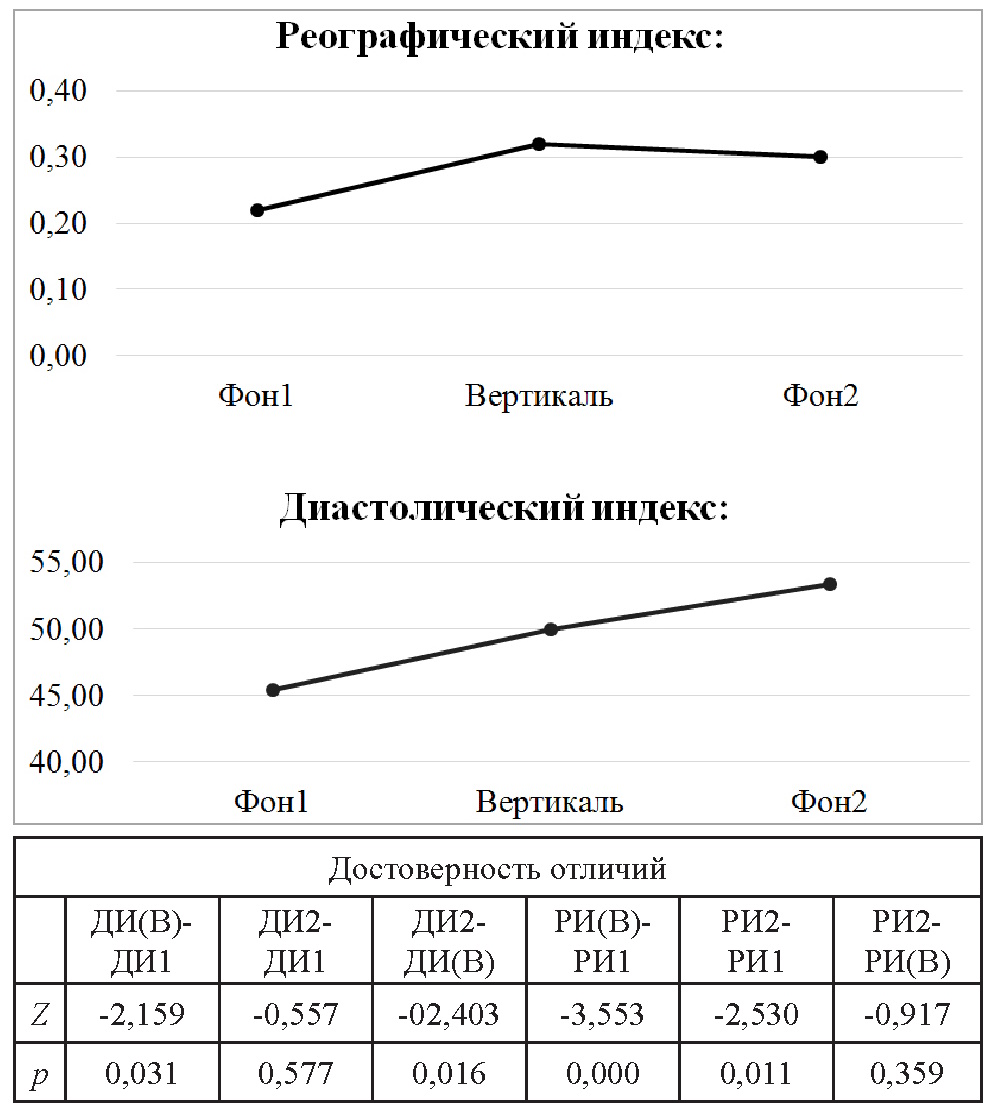 Проведен анализ поэтапной динамики исследуемых параметров: состояние покоя лежа («Фон-1») – ортостатическая проба («Вертикаль») – состояние покоя лежа («Фон-2») (таблица).