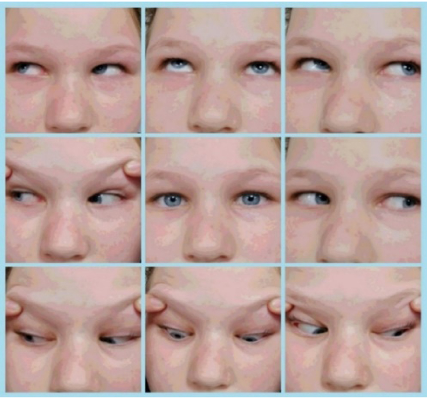 Клинический пример 1. Родители пациентки С. 10 лет обратились с жалобами на ограничение подвижности левого глаза вверх и двоение. Из анамнеза известно, что неделю назад девочка ударилась головой при падении. По данным компьютерной томографии (КТ), слева имеется трещина нижней стенки орбиты в средней трети шириной 2 мм. В зоне локализации перелома – дефект нижней прямой мышцы, предположительно разрыв, пролапс мягких тканей орбиты в верхне-челюстную пазуху до 9 мм. При объективном осмотре в первой позиции взора выявлена ортотропия и полное отсутствие подвижности левого глаза кверху (рис. 1). Пациентке поставлен диагноз: перелом нижней стенки орбиты, разрыв нижней прямой мышцы. Рекомендована ревизия зоны перелома и нижней прямой мышцы cito.