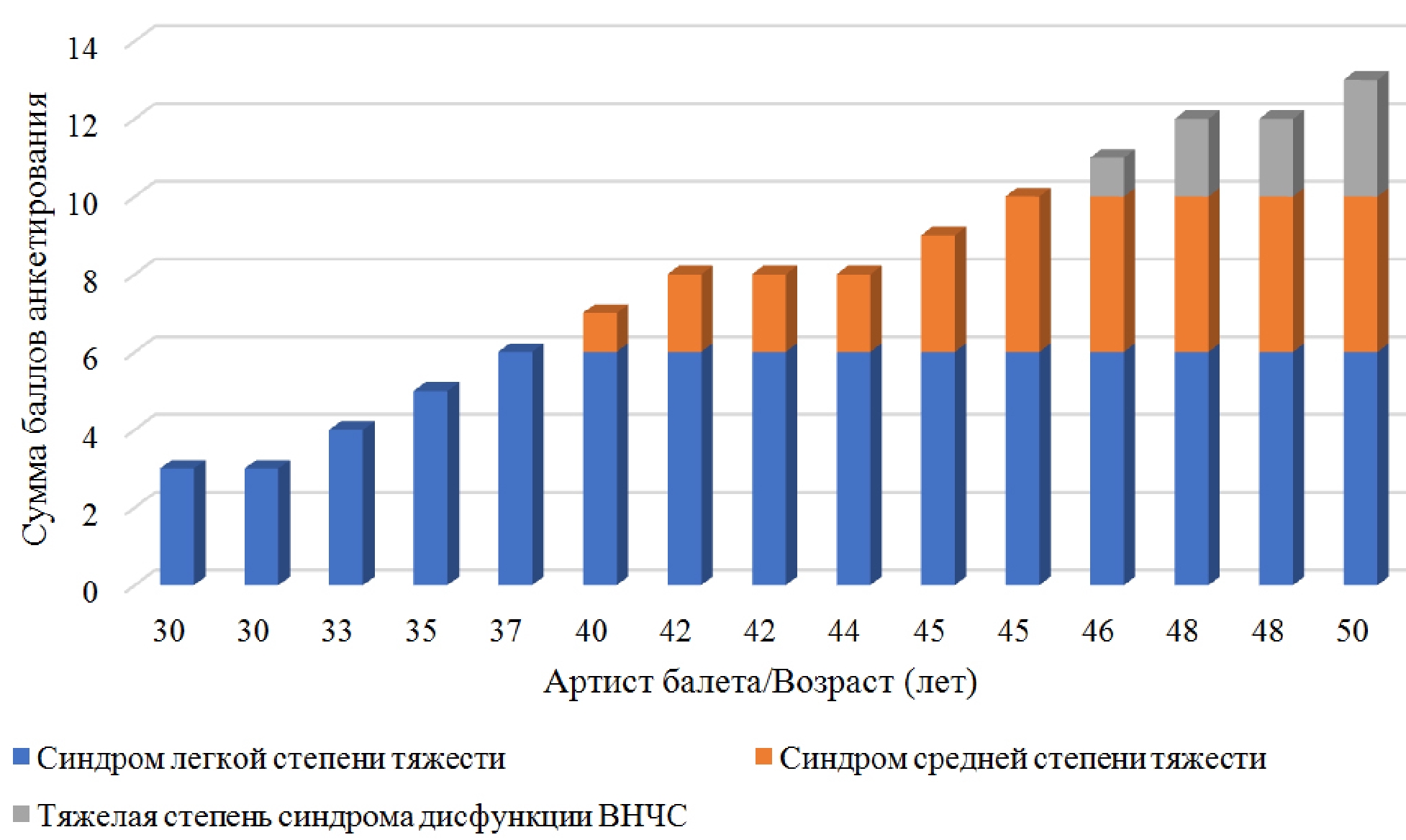 Как видно из рис. 1, сумма баллов, набранных при обследовании каждого артиста, определила степень тяжести заболевания: