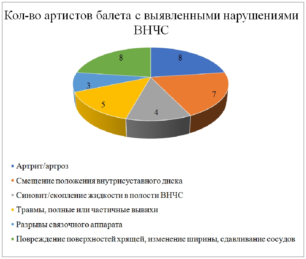 Как видно из рис. 2, большинство обследуемых артистов балета имели признаки артрита и артроза ВНЧС, смещение положения внутрисуставного диска, гипомобильность сустава различной степени выраженности.