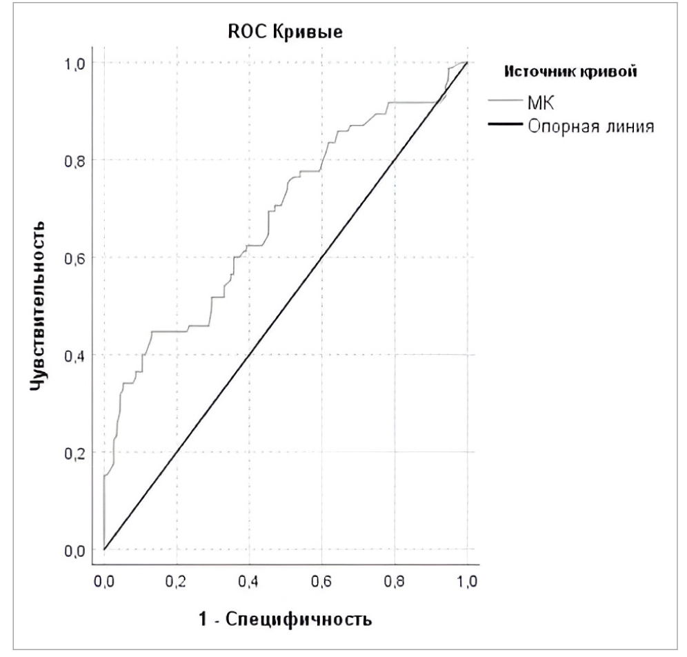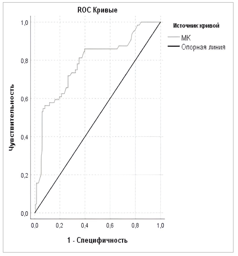 Рис. 4. ROC-кривая взаимосвязи прогноза КМР по шкале CMDS и уровня МК сыворотки крови