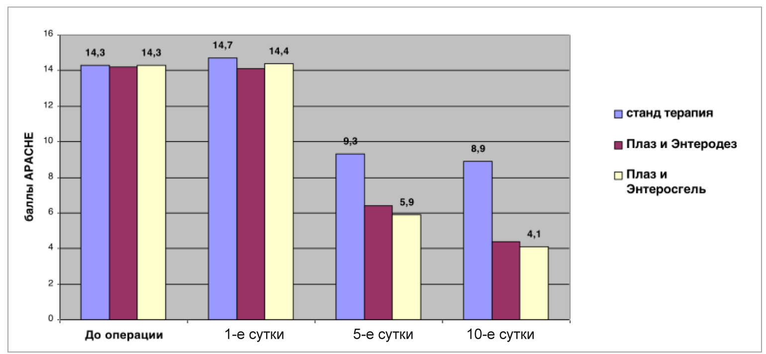Сравнение эффектов включения NO-терапии аппаратом «Плазон» совместно с энтеросорбентами энтеродез и энтеросгель в программу санации брюшной полости у пациентов с разлитым гнойным перитонитом основной группы на показатели тяжести состояния больных выявило статистически достоверные различия у 12 пациентов, получавших обработку брюшной полости монооксидом азота (NO-терапия) аппаратом «Плазон» совместно с энтеросорбентами энтеродез и энтеросгель на 5-е и 10-е сутки послеоперационного периода по шкалам APACHE II и SOFA (p < 0,05), а по шкале SOFA комбинация энтеросгеля с NO-терапией аппаратом «Плазон» достоверно отличалась от значений контрольной группы начиная с 5-го дня после операции (табл. 1, рис. 1, 2).