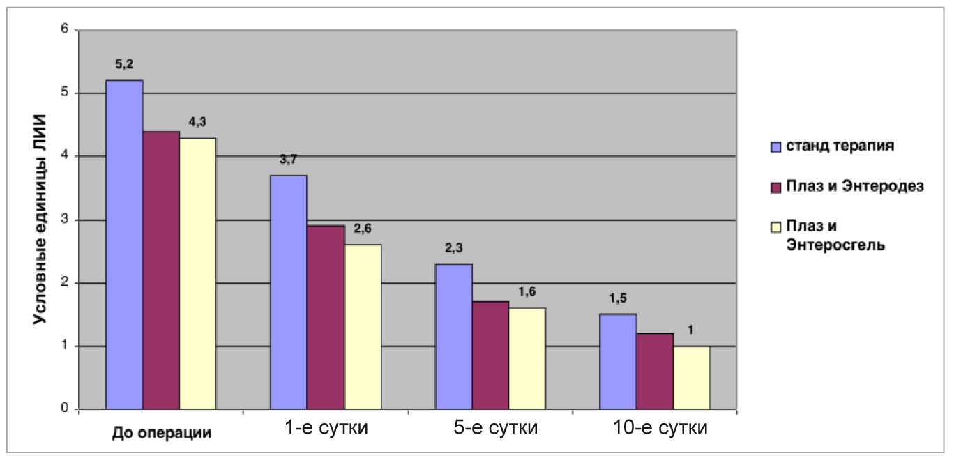 Сравнение детоксикационных эффектов у пациентов с разлитым гнойным перитонитом, получавших обработку брюшной полости аппаратом «Плазон» и энтеросорбентами энтеродез и энтеросгель, на показатели маркеров эндотоксикоза выявило статистически достоверные различия у 12 пациентов в основной группе, получавших монооксид азота с энтеросорбентами, в сравнении с контрольной группой из 30 больных: по ЛИИ на 5-е сутки после операции в комбинациях энтеродез + «Плазон» и энтеросгель + «Плазон» и суммарной комбинацией двух энтеросорбентов + «Плазон» (p < 0,05), по ЛИИ на 10-е сутки послеоперационного периода, только в комбинации энтеросгель + «Плазон» и суммарной комбинации двух энтеросорбентов + «Плазон» (p < 0,05) (табл. 2, рис. 3).