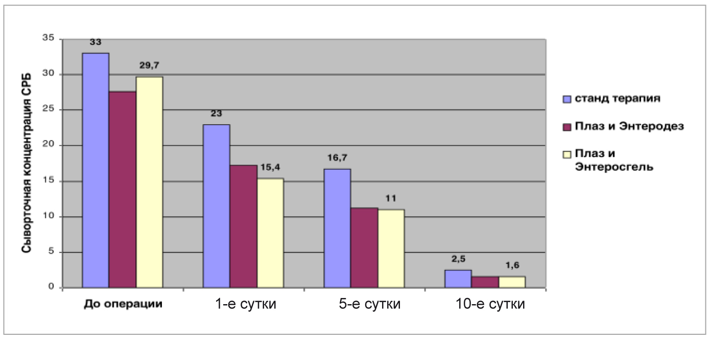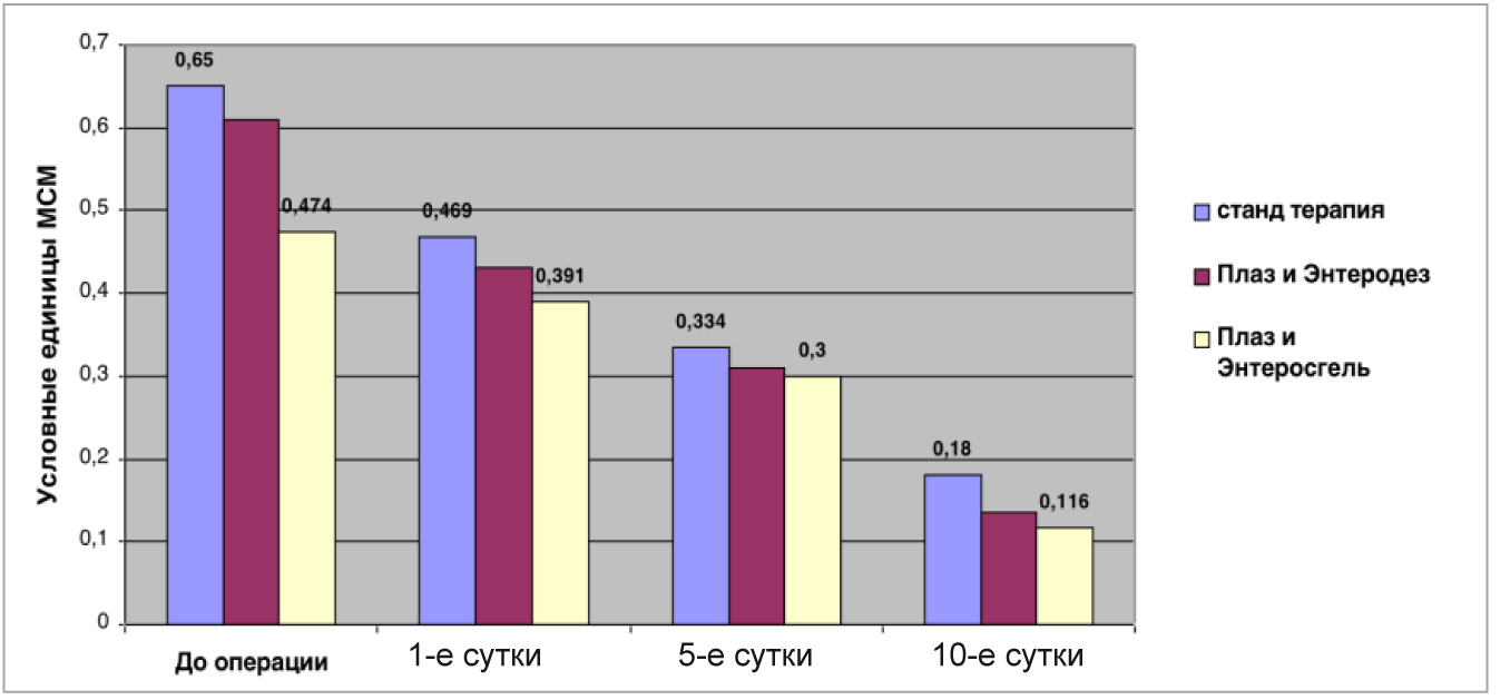По уровням МСМ различия с контролем достоверны даже в периоперационный период и на 1-е сутки после операции по всем показателям: комбинации энтеродез + «Плазон», комбинации энтеросгель + «Плазон» и суммарной комбинации двух энтеросорбентов + + «Плазон» (p < 0,05), по МСМ на 5-е сутки различия с контролем достоверны для комбинации энтеросгель + + «Плазон» и суммарной комбинации двух энтеросорбентов + «Плазон» (p < 0,05), по значениям МСМ различия с контролем достоверны на 10-е сутки после операции по всем показателям: комбинации энтеродез + + «Плазон», комбинации энтеросгель + «Плазон» и суммарной комбинации двух энтеросорбентов + «Плазон» (p < 0,05). Комбинация двух методов санации брюшной полости при перитоните выявила различия с контрольной группой, также по значениям СРБ на 1-е сутки после операции в комбинации энтеросгель + «Плазон» и суммарной комбинации двух энтеросорбентов + «Плазон» (p < 0,05), на 10-е сутки после операции в комбинациях энтеродез + «Плазон», энтеросгель + «Плазон» и суммарной комбинации двух энтеросорбентов + «Плазон» (p < 0,05) (табл. 2, рис. 4, 5).