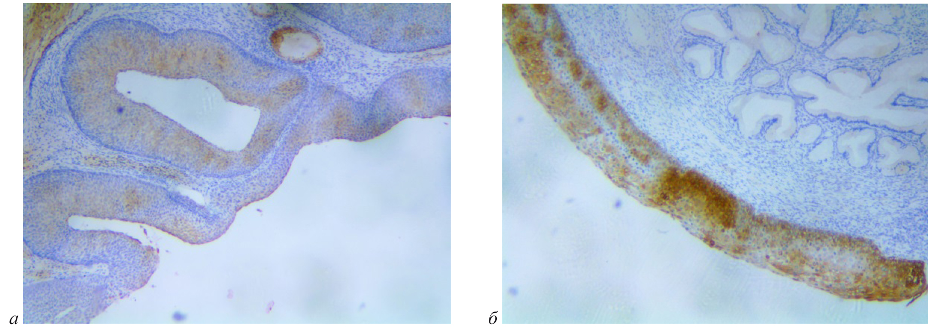 При HSIL/CIN-3, обнаруженной в 10 (62,5 %) образцах, сопряженной с ВПЧ высокого онкогенного риска, отмечалась равномерная выраженная диффузная экспрессия цитокератина-14 с максимальным значением ИЭ (2,85 усл.ед.), с поражением всей толщи эпителиального пласта, а также выраженная экспрессия СК-14 в очагах эндоцервикоза (ИЭ 2,85 усл. ед.), (см. рис. б).