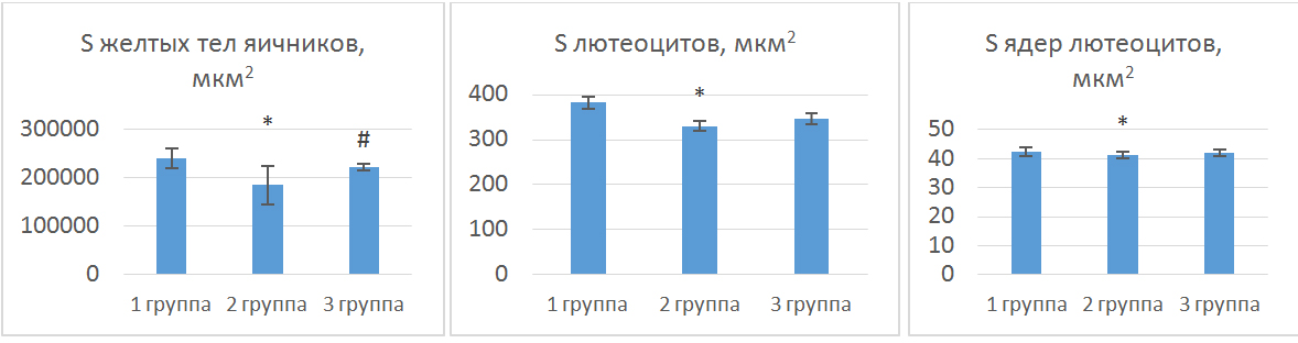 Отмечается уменьшение количества желтых тел яичников на 37,4 % (p < 0,05). Желтые тела были меньшего размера, их площадь уменьшилась на 23 % (p < 0,05) по сравнению с группой контроля. Одновременно с этим были уменьшена и площадь лютеоцитов, и их ядер на 13,5 % (p < 0,05) и 2,7 % (p < 0,05) соответственно (см. рис.).
