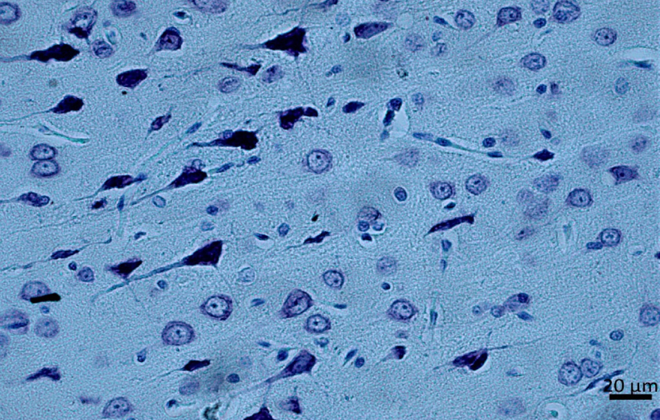 После курсового 30-дневного лечения проводили эвтаназию (декапитация под хлоралгидратным наркозом, 450 мг/кг) с последующим забором образцов тканей ГМ. Материал фиксировали в течение 24 часов в 10%-м растворе нейтрального забуференного формалина (pH 7,4), обезвоживали и заливали в парафин по общепринятой гистологической методике. На роторном микротоме изготавливали срезы толщиной 4–5 мкм. Окрашивали парафиновые срезы тионином по методу Ниссля.