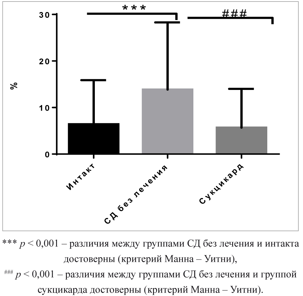 В качестве патологии была выбрана экспериментальная модель, рекомендованная для изучения отдаленных последствий СД, в которой с целью формирования его осложнений используют крыс со стрептозотоциновым диабетом длительностью 6 месяцев. Стрептозотоцин-индуцированный СД моделировали однократным внутрибрюшинным введением растворенного в цитратном буфере (0,1 М, рН 4,5) стрептозотоцина (Sigma, США) в дозе 60 мг/кг после пищевой депривации. В исследование брали животных с уровнем тощаковой (забор корма за 4 часа до измерения) гликемии ≥ 11,1 ммоль/л через 3 дня и 6 месяцев после инъекции. Для измерения уровня гликемии использовали глюкометр Contour TS и соответствующие тест-полоски (Bayer). Забор крови производили из подъязычной вены [7]. Лечение начинали через 6 месяцев после моделирования СД. Группе негативного контроля вводили физиологический раствор (крысы с СД без лечения). Исследуемое вещество, сукцикард, вводили перорально в течение 30 дней в дозе 50 мг/кг. В качестве позитивного контроля использовали крыс без СД (группа интакта) той же партии животных.