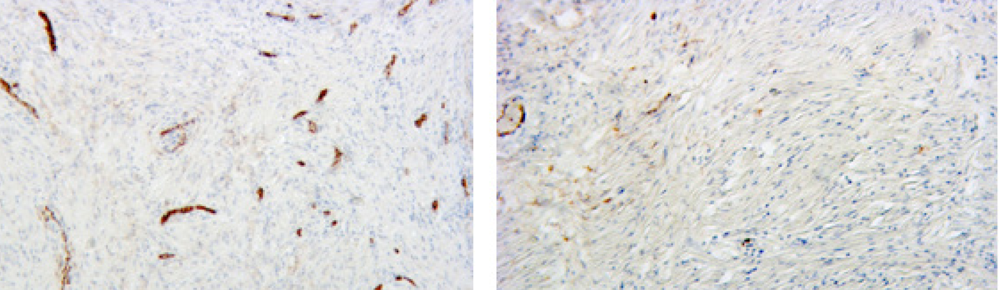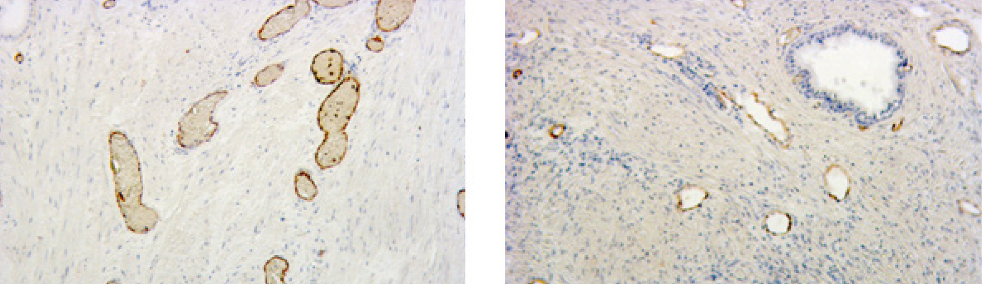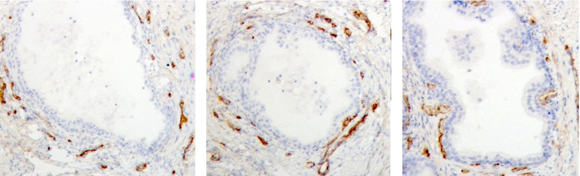 Использование ИГХ методов для выявления CD34 положительного окрашивания эндотелия в сосудах МЦР позволяет оценить закономерности расположения, плотность и диаметры микрососудов в структурных компонентах простаты.