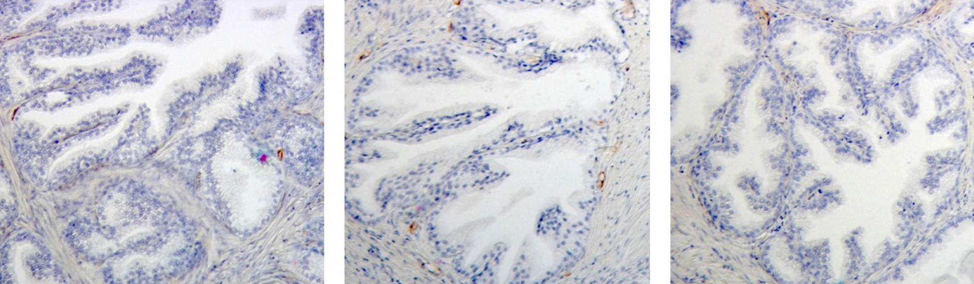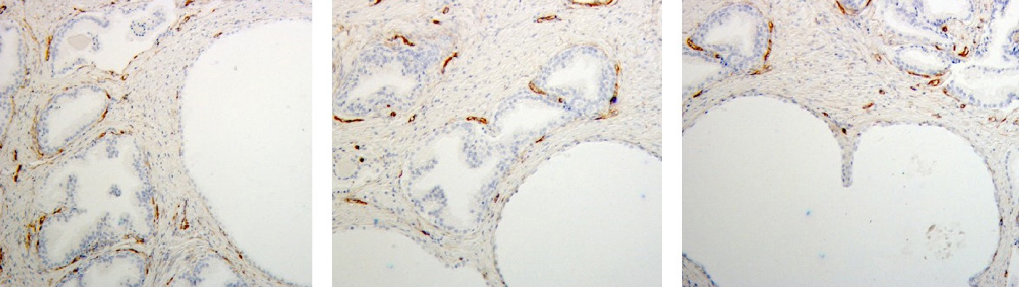 Фрагменты предстательной железы фиксировали в забуференном формалине, подвергали стандартной проводке и заливали в гистомикс. Изготавливали срезы толщиной 5 мкм. Иммуногистохимическое (ИГХ) исследование эндотелиального фактора CD34 +, клон QBEnd-10 проводили с использованием готовых к использованию первичных моноклональных антител (Dako Cytomation, Дания), по инструкции производителя. АГ-позитивные эндотелиоциты в составе МЦР простаты определяли по коричневому окрашиванию на светооптическом уровне при увеличении микроскопа × 100 Primo Star (Zeiss, Германия). Обсчет количества сосудов проводили методом точечного счета в квадратной тестовой системе на 88 точек в 40 изображениях на группу. Морфометрическое исследование проводилась в 2 структурных компонентах простаты: в фиброзно-мышечной строме простаты, где учитывалась относительная площадь МЦР и площадь мышечно-фиброзной стромы и в железисто-мышечных комплексах, где определялись относительные площади четырех структурных компонентов: сосудов МЦР, просвета желез, эпителиальной выстилки желез и мышечно-соединительнотканного компонента, окружающего базальную мембрану желез.