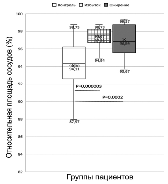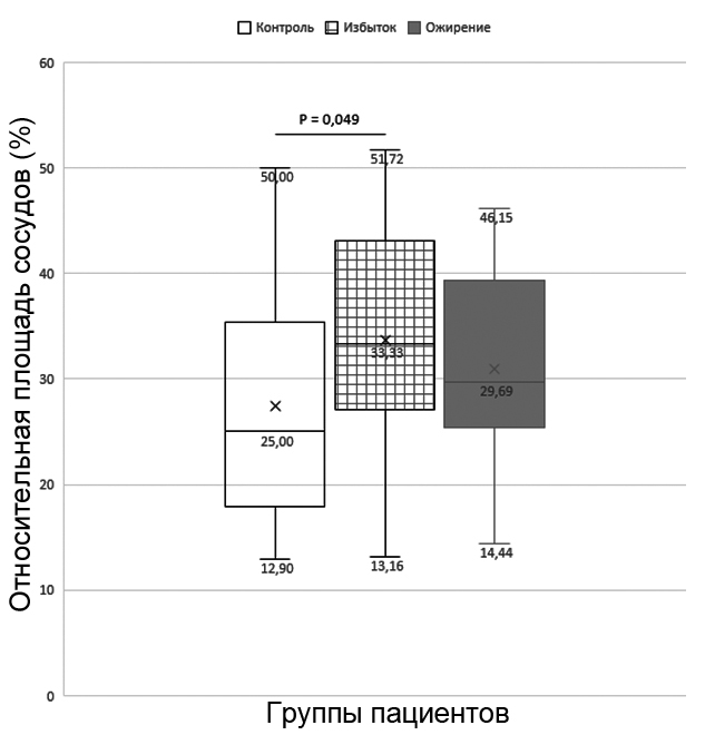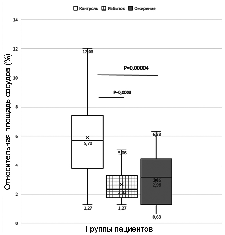 Рис. 8. Относительная площадь сосудов МЦР в мышечно-фиброзном компоненте предстательной железы в группах мужчин с разной массой тела