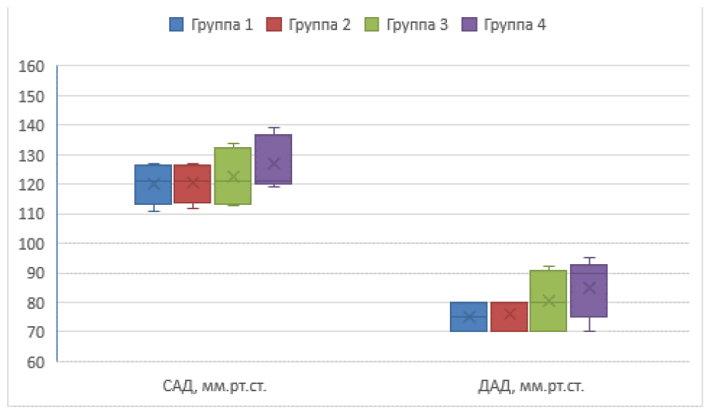 Рис. 1. Медианные значения и квартильный диапазон уровня САД и ДАД в исследуемых группах