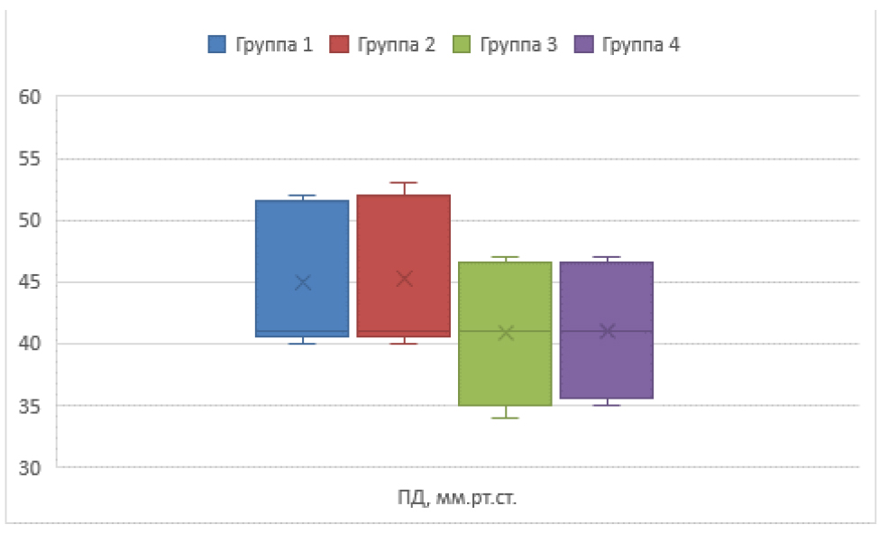 СДД, мм рт. ст. | 92 85;97 р1-4 = 0,003 | 94 88;97 р2-4 = 0,004 | 94 86;104 | 94 87;105 |