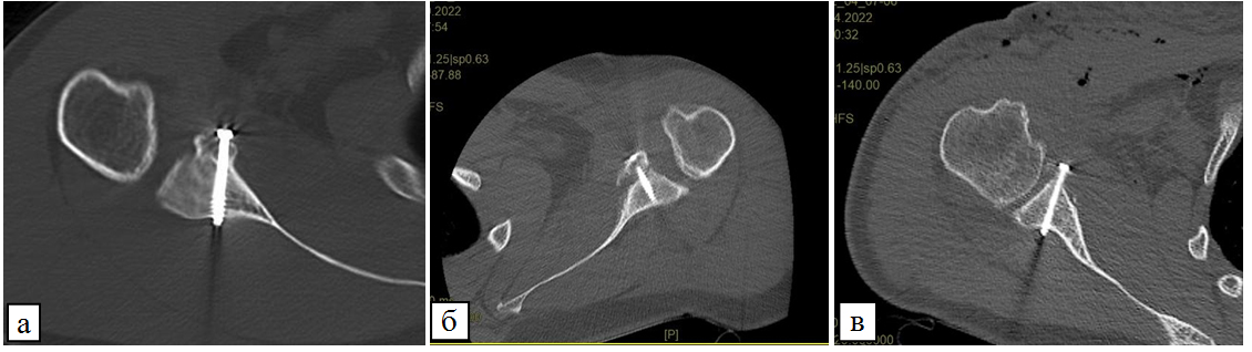 По данным предоперационного КТ-исследования, средняя величина предоперационного дефекта суставного отростка лопатки составила 18,6 % относительно противоположного сустава (0–34 %). В 62 случаях было выявлено костное повреждение Банкарта, в 10 – костная эрозия. В 4 случаях костный дефект отсутствовал. При анализе послеоперационных КТ, согласно классификации Zhu Y. с соавт., резорбция костного блока трансплантатов произошла в 49 случаях (64,4 %), из них 1-й степени – в 27 (55,1 %), 2-й степени – в 16 (32,6 %) и 3-й степени – в 6 (12,2 %) случаях (рис.).