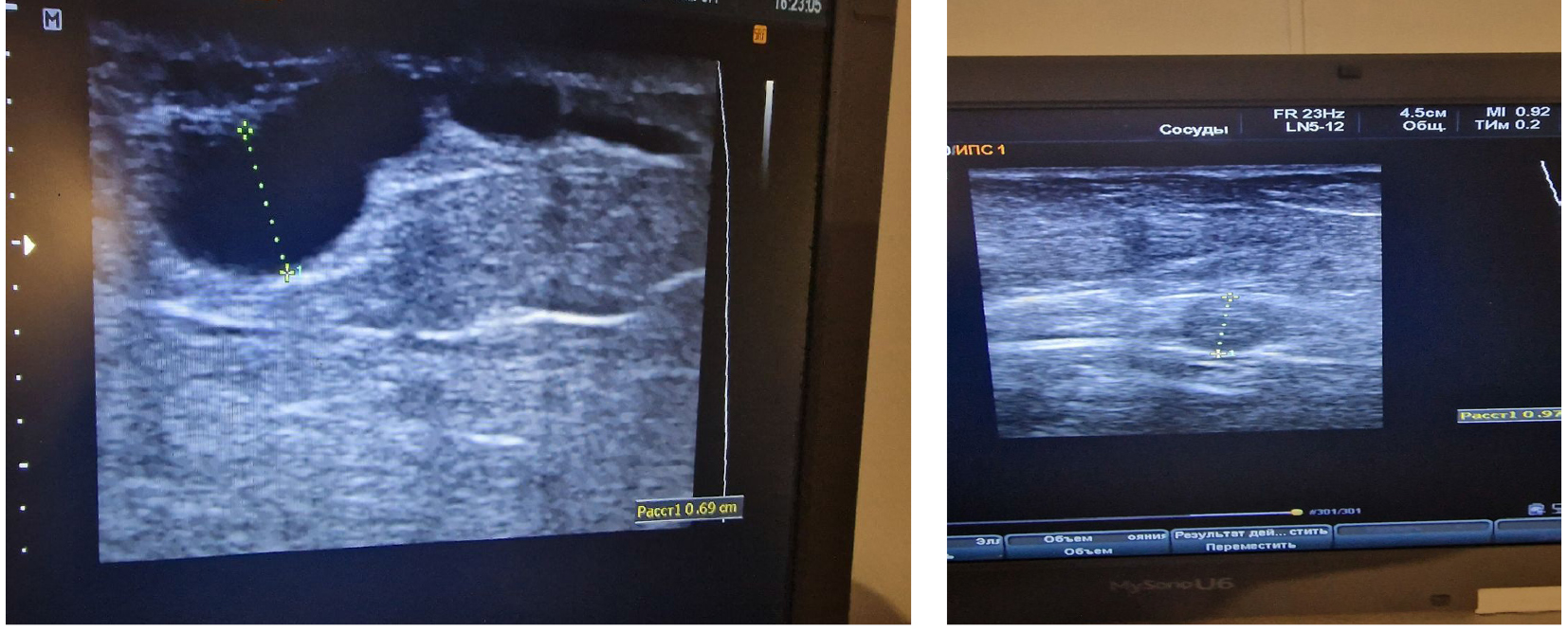 При осмотре нижних конечностей выявлены варикозные изменения поверхностных вен. Пациентке проведено ультразвуковое исследование вен нижних конечностей. В глубокой вене бедра выявлен флотирующий тромб (рис. 1 а), поверхностные вены расширены (рис. 1 б), кровоток в коммуникантах инверсирован.