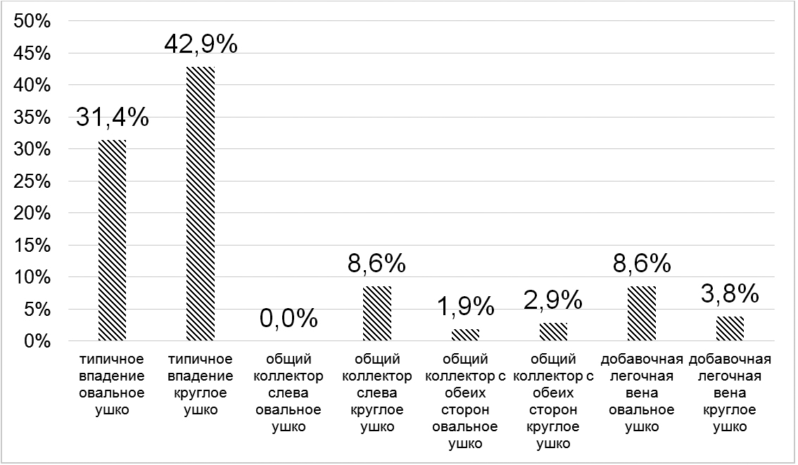 При изучении частоты встречаемости различных вариантов анатомического строения левого предсердия у обследуемых лиц выявлено, что наиболее часто встречающимся вариантом строения являлось типичное впадение легочных вен в сочетании с круглой формой устья ушка в 42,9 % случаев, вторым по частоте встречаемости явилось сочетание типичного впадения легочных вен с овальным устьем ушка левого предсердия – 31,4 %, общий коллектор легочных вен слева в сочетании с круглым устьем ушка ЛП и вариант с добавочной легочной веной и овальным устьем ушка левого предсердия встречались в 8,6 % случаев соответственно, добавочная легочная вена и устье круглой формы ушка левого предсердия выявлены у 3,8 % обследуемых лиц. В 2,9 % случаев выявлено наличие общего коллектора легочных вен с обеих сторон в сочетании с круглым устьем ушка ЛП, одним из редких вариантов анатомического строения является общий коллектор легочных вен с обеих сторон с овальным устьем ушка ЛП – 1,9 % случаев. В ходе исследования сочетание общего коллектора впадения легочных вен слева с овальной формой устья ушка ЛП не встречено. Данные о частоте встречаемости различных вариантов формы ушка левого предсердия и варианта впадения легочных вен среди всех обследуемых лиц отображены на рис. 1.