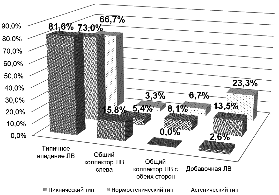 Одним из оцениваемых в ходе исследования параметров анатомического строения ЛП являлось изучение взаимосвязи между типом впадения ЛВ и типом телосложения. При оценке взаимосвязи вариантов впадения ЛВ и типов телосложения выявлено, что у лиц пикнического типа телосложения преобладает типичный вариант впадения ЛВ, который встречался в 81,6 % (р = 0,515) случаев, вариант с общим коллектором ЛВ слева встречался в 15,8 % случаев (р = 0,353), анатомический вариант впадения добавочной ЛВ встретился в 2,6 % случаев (р = 0,422), вариант впадения ЛВ общим коллектором с обеих сторон при проведении анализа полученных данных не выявлен. У лиц нормостенического типа телосложения также преобладал типичный вариант впадения ЛВ 73,0 % (р = 0,515) случаев, при этом анатомический вариант впадения добавочной ЛВ встретился в 13,5 % случаев (р = 0,422), следует отметить, что вариант впадения ЛВ общим коллектором с обеих сторон выявлен в 8,1 % случаев (р = 0,217), наиболее редким вариантом впадения являлся общий коллектор ЛВ слева, который встречался в 5,4 % случаев (р = 0,353). В ходе анализа базы данных у лиц астенического типа телосложения, как и у лиц других типов телосложения, преобладал типичный вариант впадения ЛВ – 66,7 % (р = 0,515) случаев, вторым по частоте встречаемости установлен вариант впадения добавочной ЛВ 23,3 % случаев (р = 0,422), вариант впадения ЛВ общим коллектором с обеих сторон встречался в 6,7 % случаев (р = 0,217), наименее часто встречающимся вариантом впадения являлся общий коллектор ЛВ слева, который встречался в 3,3 % случаев (р = 0,353).