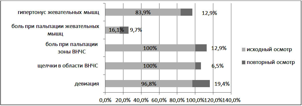 При повторном осмотре через 14–30 дней в группе 1 (31 человек) отмечалось уменьшение выявляемых признаков дисфункции ВНЧС: гипертонус жевательных мышц наблюдался лишь у 12,9 % пациентов, боль при пальпации жевательных мышц у 9,7 % и зоны ВНЧС у 12,9 % исследуемых; щелчки в области ВНЧС у 6,5 % пациентов, девиация выявлялась лишь у 19,4 % исследуемых в этой группе (см. рис. 1).