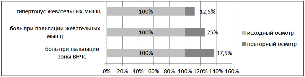 В группе 3 при повторном осмотре снижение гипертонуса жевательных мышц было до 12,5 % пациентов, боли при пальпации жевательных мышц – до 25 % и зоны ВНЧС – до 37,5 % исследуемых (рис. 3).