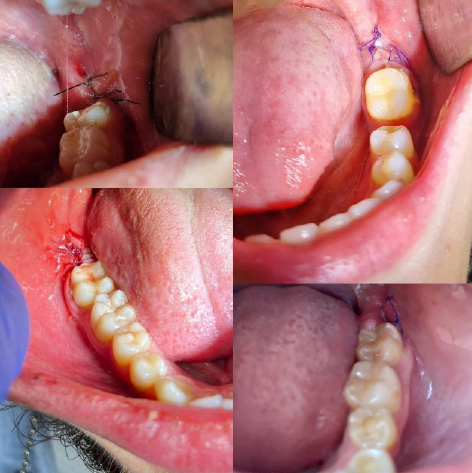 Всем пациентам проведено обследование, составлен план лечения. Операция атипичного удаления проводилась максимально щадящим способом с отслаиванием слизисто-надкостничного лоскута, трепанацией кортикальной пластинки костной и фрагментацией удаляемого зуба. Операционная рана заполнялась остеопластическим материалом, слизисто-надкостничный лоскут укладывался на место, накладывались узловые швы синтетическим, монофиламентым шовным материалом (рис. 4).