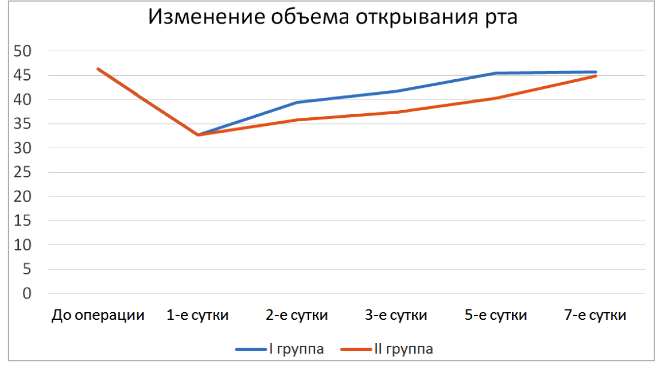 Перед проведением операции всем пациентам было проведено измерение объема открывания рта, среднее значение варьировалось в пределах (46,23 ± 1,32) мм.