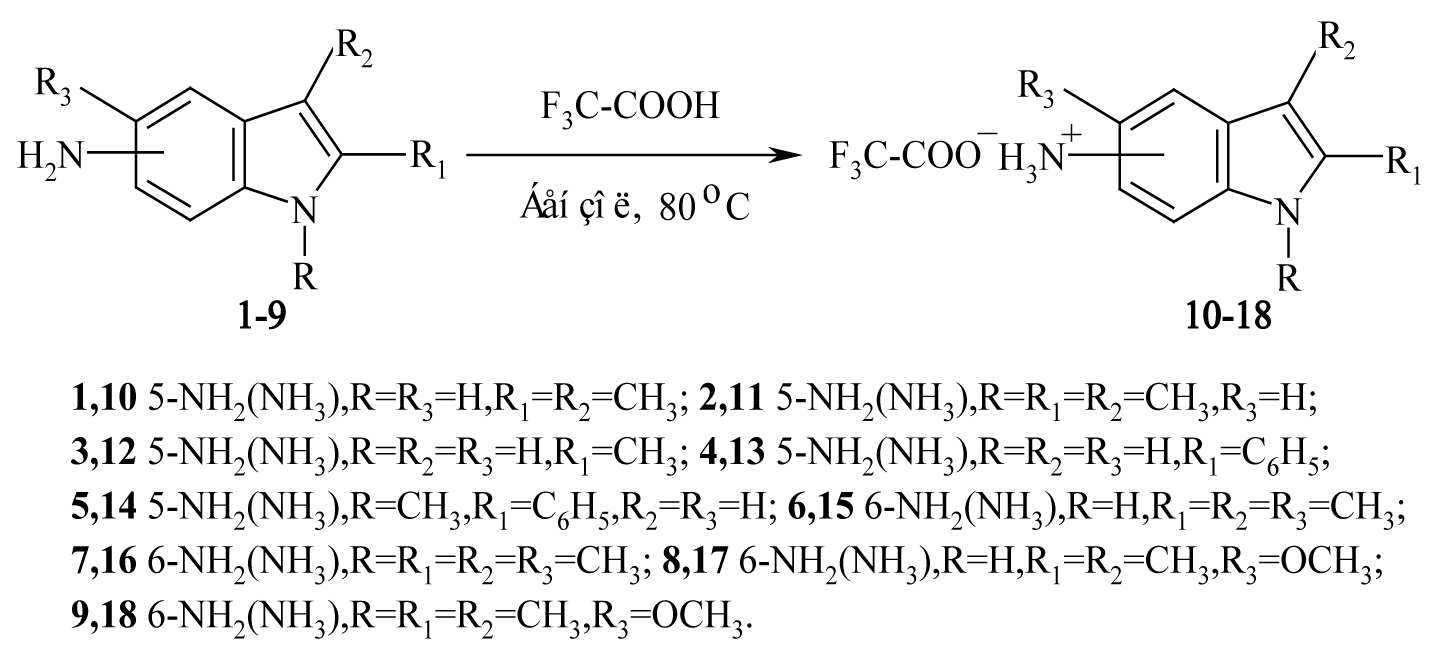 Осуществляя целенаправленный поиск новых биологически активных соединений, авторы работы [1, 2] на основе 1Н-индол-5,6-иламинов 1–9 получили растворимые в воде трифторметилсодержащие производные индола – 1Н-индол-5,6-иламиния трифторацетаты 10-18 с ярко выраженной противомикробной активностью (рис. 1).