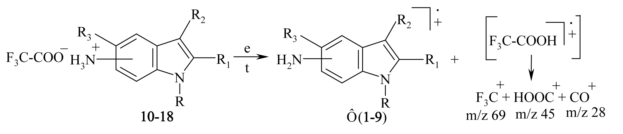 Масс-спектры 1Н-индолиламиния трифторацетатов 10–18 зарегистрированы на масс-спектрометре «Finnigan MAT INCOS-50» методом прямого ввода соединений в ионный источник при энергии ионизации 70 эВ и повышенной температуре, при которой соли разлагаются с выбросом противоионов: солеобразующей кислоты и органического основания, как это описано при исследовании бипиридиниевых солей в работе [4]. В этих условиях в масс-спектрах фиксируются сигналы молекулярных ионов кислоты, соответствующего основания и их фрагментные ионы.