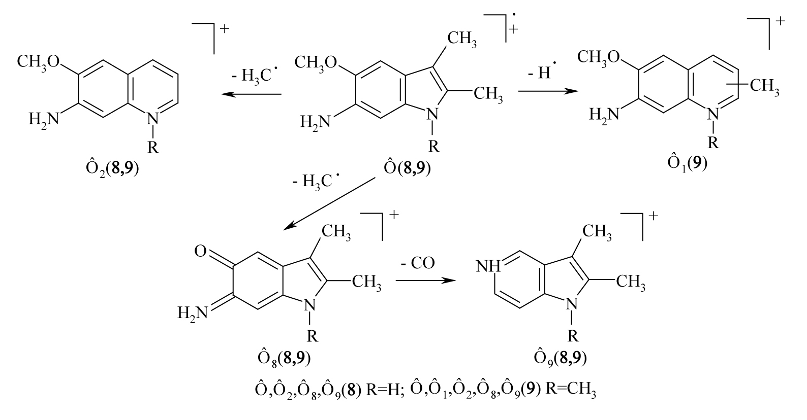 В масс-спектрах соединений 17, 18 наряду с сигналами молекулярных ионов Ф(8) с m/z 190, Ф(9) с m/z 204 с максимальной интенсивностью проявляются также высокоинтенсивные сигналы фрагментных ионов Ф2(8) с m/z 175, Ф2(9) с m/z 189, соответствующие по массовому числу элиминированию метильного радикала от молекулярных ионов. Это свидетельствует о том, что соединения 8, 9 являются 2,3-диметилированными индольными структурами (рис. 5).