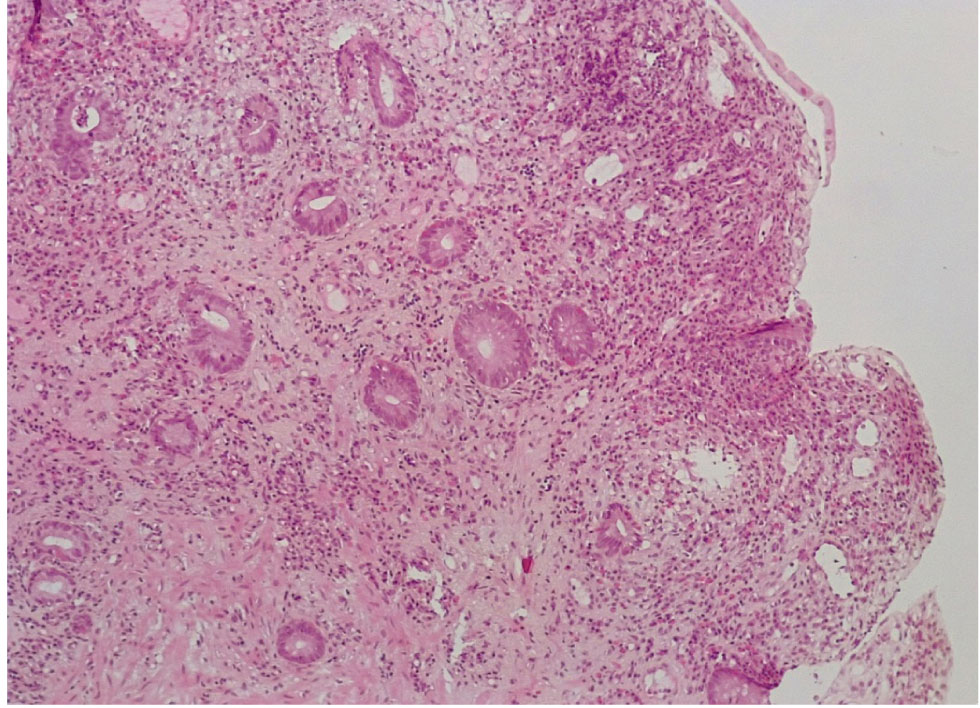 В отдельных участках СО при НЯК встречались единичные крипты, содержащие отдельные бокаловидные клетки и альциан + гликопротеиды (нейтральные мукополисахариды), резко выраженное хроническое воспаление стромы с развитием рыхлой волокнистой соединительной ткани (фиброза) (+++ степень атрофии и фиброза) (рис. 6).
